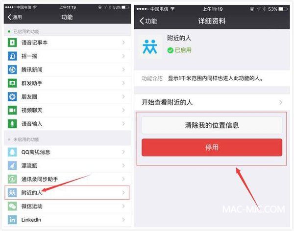 打開微信,依次點擊[我]—[設(shè)置]—[通用]—[功能],選擇[附近的人],點擊進去后點擊關(guān)閉[清除我的位置信息]和[停用]。