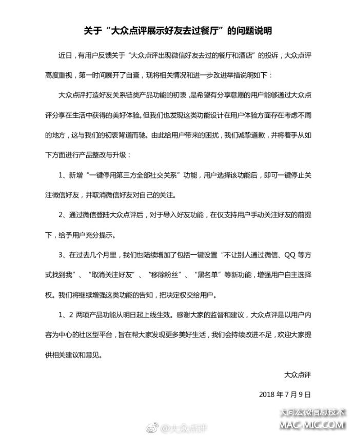 對(duì)此,大眾點(diǎn)評(píng)通過(guò)官方微博發(fā)布聲明,對(duì)因相關(guān)產(chǎn)品功能給用戶造成的困擾表示誠(chéng)摯道歉,并提出了三條整改措施,包括新增“一鍵停用第三方全部社交關(guān)系”功能;通過(guò)微信登錄并導(dǎo)入好友關(guān)系,在支持用戶手動(dòng)關(guān)注的情況下給予充分提示;增加包括一鍵設(shè)置“不讓別人通過(guò)微信、QQ等方式找到我”“取消關(guān)注好友”“移除粉絲”“黑名單”等新功能。